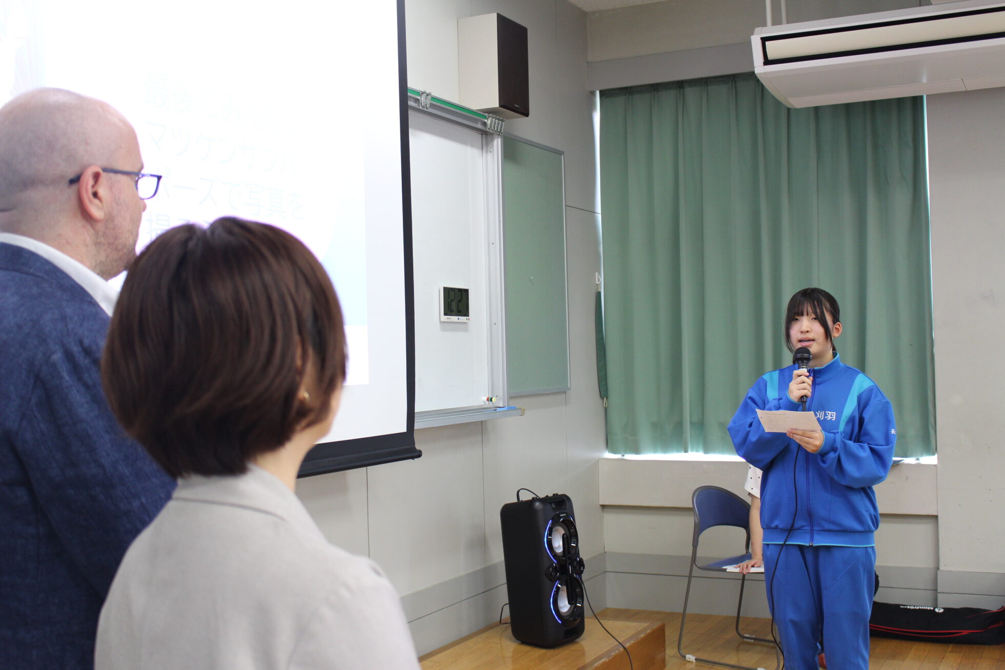 生徒会長の長橋結衣さんが、ソコールさんと米澤さんに感謝の言葉を伝えました。