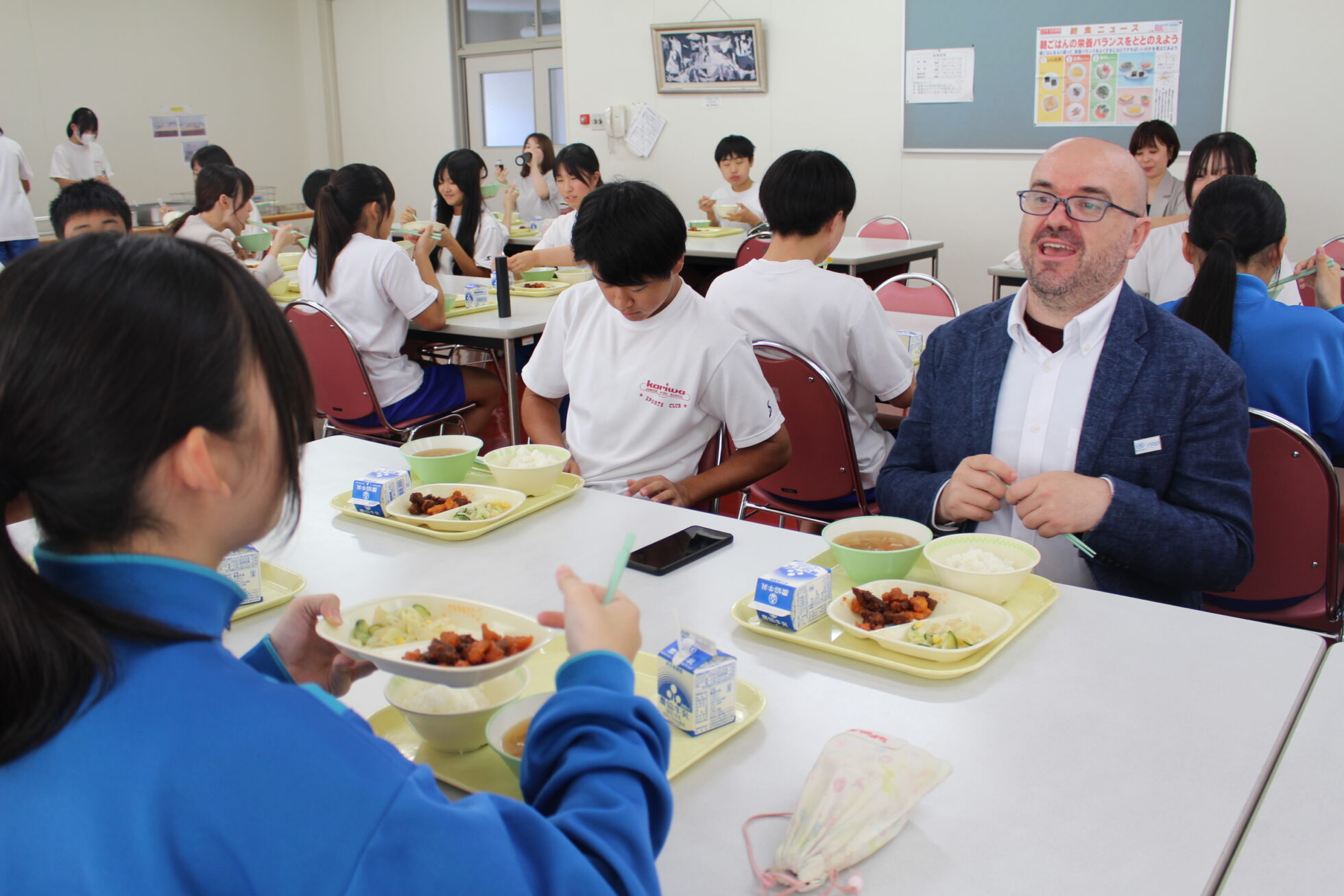 授業後、給食を囲んで生徒と交流するソコールさん。学校給食の食べ残しを減らすことも、食品ロスの削減としてSDGsの取り組みにつながります。 「夏休みは楽しめましたか?」「日本のアニメを知っていますか?」―。生徒たちは翻訳アプリの力も借りながら、積極的に会話を楽しんでいました。