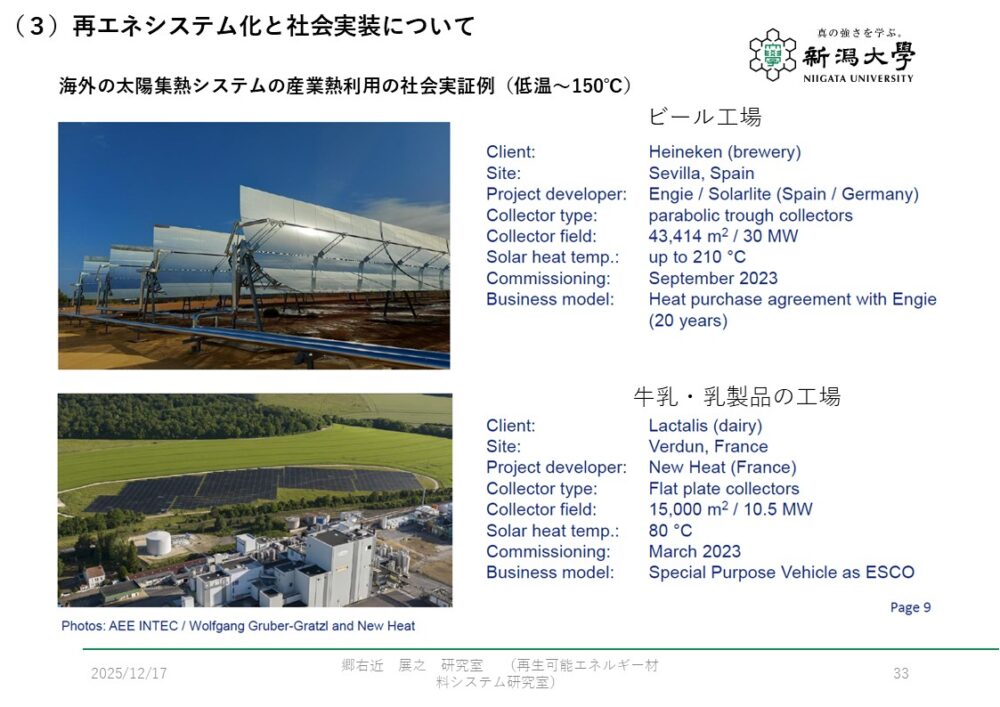 その下はフランスの牛乳とか乳製品の工場での熱供給に使っている例で、温度レベルで言うと80度ぐらいです。80度ぐらいの熱を太陽熱から供給して、それで非常にクリーンで環境イメージのいい商品としてブランディングして販売しているということが既に社会的な実証例として報告されています。