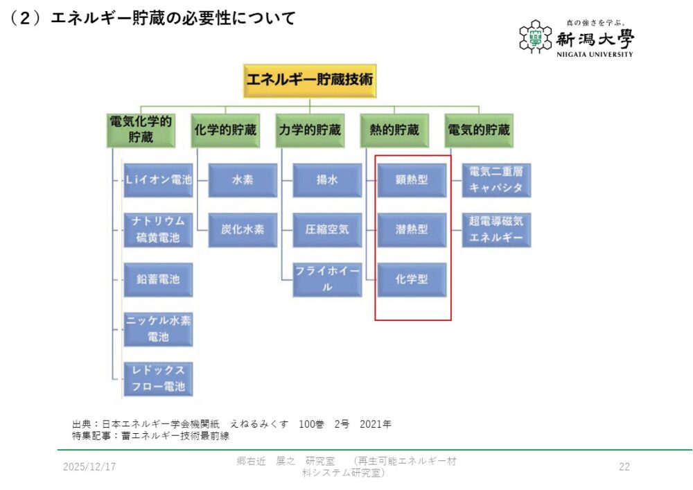 では熱はというと、その大体中間ぐらいです。バッテリーと水素をつなぐ、エネルギー貯蔵のレベルとしては量的にも時間的にも中間のエネルギー貯蔵技術というふうに見ることができます。