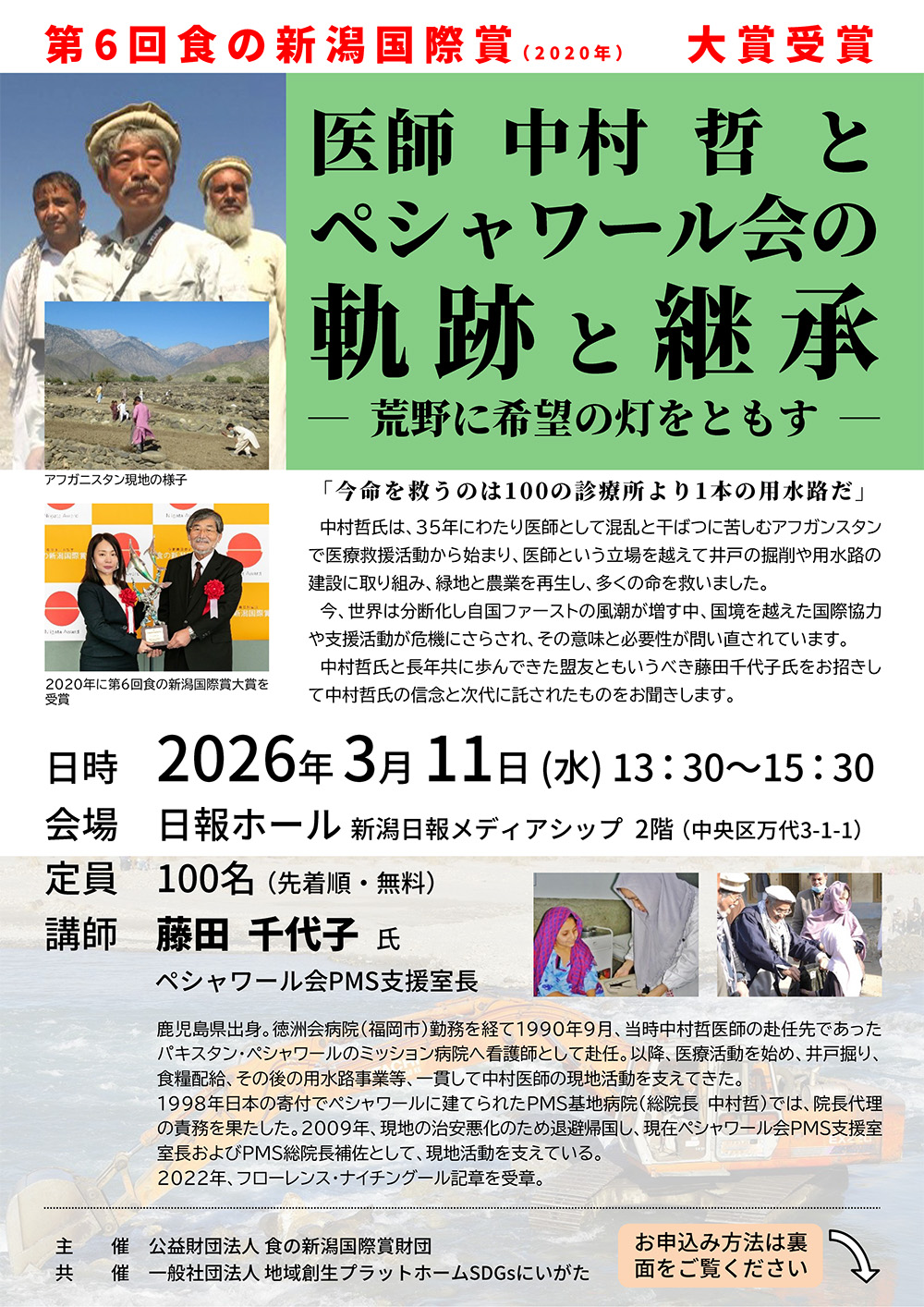 食の新潟国際賞財団主催、SDGsにいがた共催。中村医師は戦乱と干ばつに苦しむアフガンスタンにおいて35年にわたり医療救援活動を行ったほか、井戸の掘削や用水路の建設に取り組み、緑地と農業を再生し、多くの命を救いました。2019年12月、現地で武装勢力に銃撃され無念の死を遂げましたが、その功績はいまも現地で語り継がれ、中村医師の活動をサポートしたペシャワール会は遺志を継ぎ、いまもアフガニスタン支援活動を続けています。